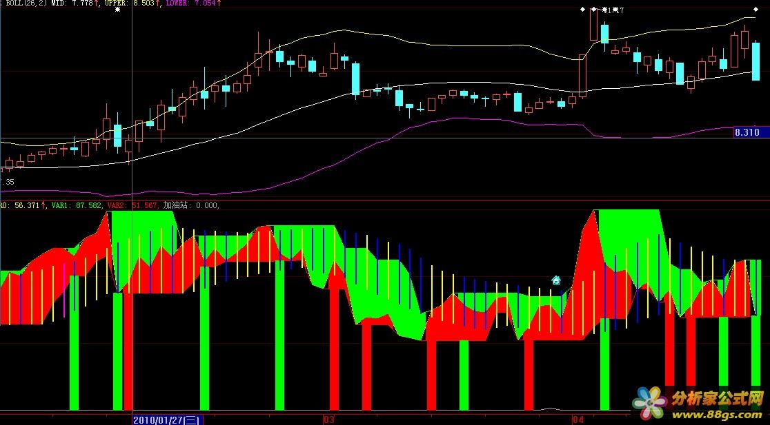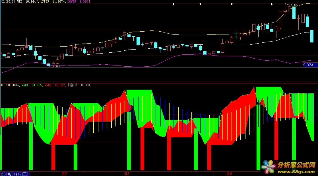 红绿色块配合黄蓝粉柱线是趋势参考;