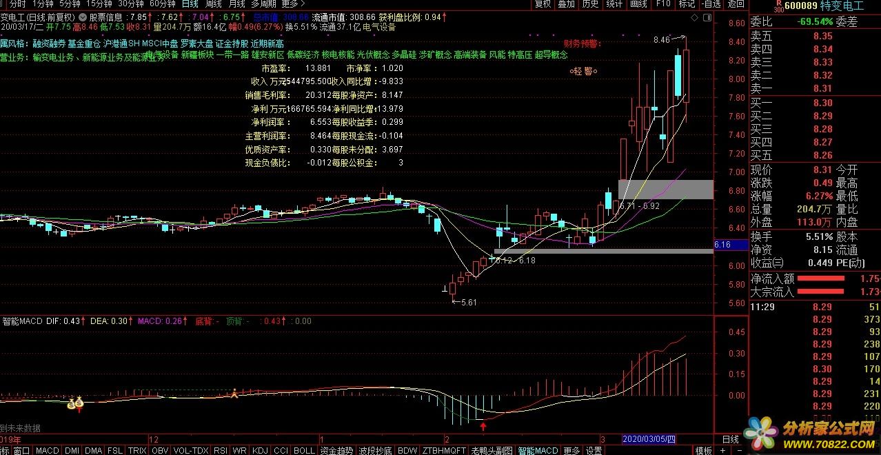 该指标为智能MACD,包含了MACD指标的基本公式以及一些自定义的信号提醒。其中,SHORT设定为12,LONG设定为26,MID设定为9。通过计算DIF和DEA得到MACD指标,并在图表中进行展示和标注交易信号。