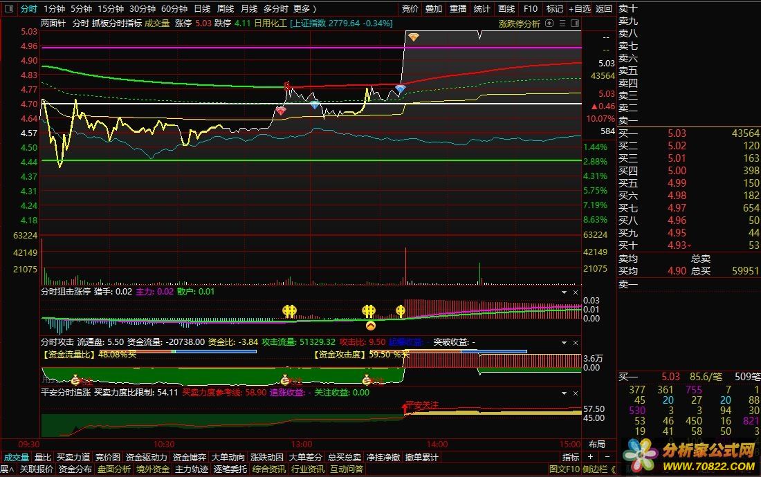 FX1:=VOL/CLOSE/3;FX2:=SUM(IF(FX1>0.2 AND CLOSE>REF(CLOSE,1),FX1,0),0);FX3:=SUM(IF(FX1>0.2 AND CLOSE<REF(CLOSE,1),FX1,0),0);FX4:=FX2+FX3;FX5:=1;FX6:=FX2/FX3;FX7:=EMA((-100)*(HHV(HIGH,34)-CLOSE)/(HHV(HIGH,34)-LLV(LOW,34)),4)+100;FX8:=MAX(DYNAINFO(3),DYNAINFO(5));FX9:=MIN(DYNAINFO(3),DYNAINFO(6));FX10:=FX8-FX9;FX11:=FX9+FX10*7/8;FX12:=FX9+FX10*0.5/8;FX13:=SUM(CLOSE*VOL,240)/SUM(VOL,240);FX14:=BARSCOUNT(CLOSE);FX15:=MA(CLOSE,FX14);FX16:=FX15+2*STD(CLOSE,3);FX17:=FX15-2*STD(CLOSE,3);FX18:=TIME>93000;FX19:=CLOSE/REF(CLOSE,1)>1.02;FX20:=CLOSE/REF(CLOSE,1)<0.98;FX21:=(HHV(CLOSE,FX14)-LLV(CLOSE,FX14))/CLOSE<0.05;FX22:=SMA(VOL,30,1);FX23:=(FX22-LLV(LLV(FX22,1),30))/(HHV(HHV(FX22,1),30)-LLV(LLV(FX22,1),30))>0.95;FX24:=FX19 OR FX20;FX25:=FX24=0 AND FX21 AND FX23 AND CROSS(FX13,FX15);IF(MACD.DEA<0,CLOSE,DRAWNULL),COLORYELLOW,LINETHICK9;FX26:=SUM(AMOUNT,BARSCOUNT(CLOSE))/SUM(VOL*100,BARSCOUNT(CLOSE));FX27:=EXPMA(CLOSE/FX26,20);FX28:=EXPMA(CLOSE/FX26,60);FX29:=EXPMA(CLOSE/FX26,120);FX30:=1;1.02,NODRAW;FX31:=1.03;FX32:=FX27>FX28 AND FX27>1.003 AND FX28>FX29 AND CLOSE>EXPMA(CLOSE,20) AND EXPMA(CLOSE,10)>EXPMA(CLOSE,20) AND EXPMA(CLOSE,20)>EXPMA(CLOSE,60);DRAWICON(FX27>FX28 AND FX28>FX29 AND CLOSE>EXPMA(CLOSE,20) AND EXPMA(CLOSE,10)>EXPMA(CLOSE,20) AND EXPMA(CLOSE,20)>EXPMA(CLOSE,60) AND FX27=HHV(FX27,30) AND CROSS(FX27,1.003),CLOSE,25);DRAWICON(CROSS(FX27,1.02),CLOSE,24);DRAWICON(CROSS(FX27,1.04),CLOSE,26);FX33:=MAX(DYNAINFO(3),DYNAINFO(5));FX34:=MIN(DYNAINFO(3),DYNAINFO(6));FX35:=FX33-FX34;{程序化久久公式网}压力线:FX34+FX35*7/8,COLORMAGENTA,LINETHICK2;支撑线:FX34+FX35*0.5/8,COLORGREEN,LINETHICK2;中线:(支撑线+压力线)/2,COLORWHITE,LINETHICK2;FX36:=SUM(IF(CLOSE>REF(CLOSE,1) AND VOL>4000,VOL/1000,0),0);FX37:=SUM(IF(CLOSE<REF(CLOSE,1) AND VOL>4000,VOL/1000,0),0);FX38:=SUM(IF(CLOSE>REF(CLOSE,1),VOL/1000,0),0);FX39:=SUM(IF(CLOSE<REF(CLOSE,1),VOL/1000,0),0);FX40:=FX38-FX36;FX41:=FX39-FX37;FX42:=FX36;FX43:=FX37;FX44:=FX40;FX45:=FX41;FX46:=FX36-FX37;FX47:=FX40-FX41;FX48:=FX38-FX39;FX49:=CONST(MAX(ABS(FX42),MAX(ABS(FX43),MAX(ABS(FX44),ABS(FX45)))));地:EMA(FX13,50)/0.97,COLORGREEN,LINETHICK2;IF(地>REF(地,1),地,DRAWNULL),COLORRED,LINETHICK2;平衡线:(FX13+地)/2,DOTLINE,COLORGREEN;FX50:=COUNT(VOL>4000 AND CLOSE>REF(CLOSE,1),0);黄次数:COUNT(VOL>DYNAINFO(16)*10 AND CLOSE>REF(CLOSE,1),0),NODRAW,COLORYELLOW;DRAWICON(FX50>REF(FX50,1) AND 黄次数>REF(黄次数,1) AND CROSS(CLOSE,地),CLOSE,7);DRAWICON(FX40>FX41 AND FX36>FX40 AND FX41>FX37,FX13,38);SUM(VOL*CLOSE,0)/SUM(VOL,0),COLORYELLOW;{程序化交易 www.cxh99.com }