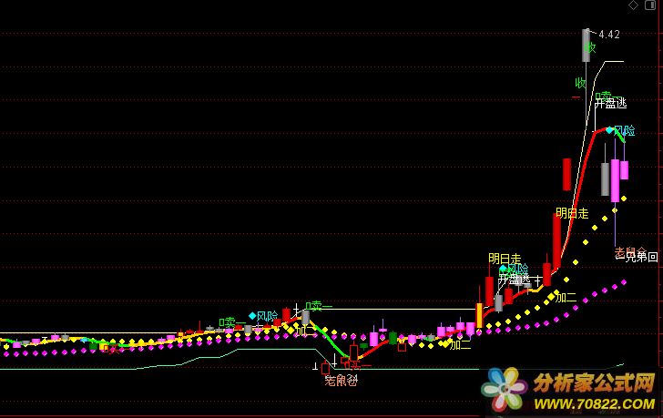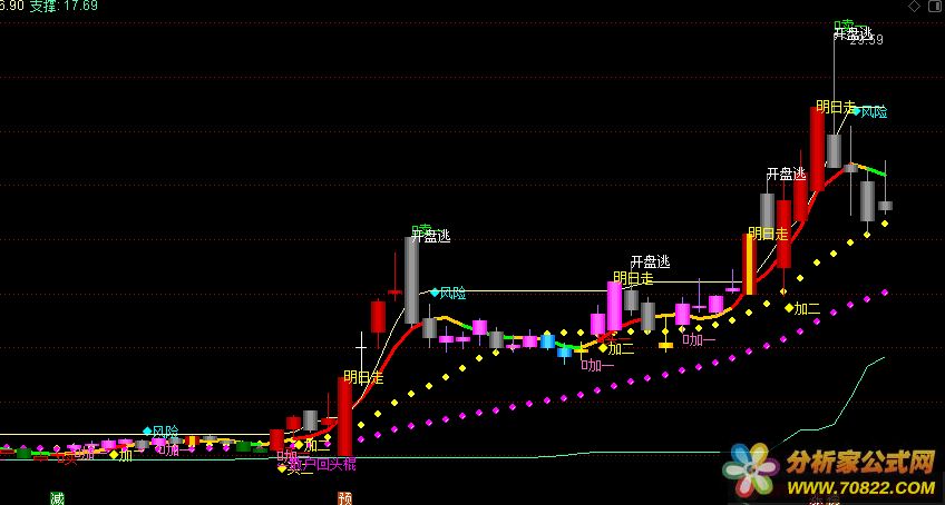 {逆势操盘主图}基础线:MA(C,5),LINETHICK3,COLOR00CCFF;刚柔线:MA(C,13),CIRCLEDOT,COLORYELLOW;生命线:MA(C,34),CIRCLEDOT,COLORMAGENTA;MA05:=MA(C,5);MA10:=MA(C,10);MA20:=MA(C,20);MA30:=MA(C,30);五日乖离率:=(C-MA05)/MA05*100;BB05:=ATAN((MA05/REF(MA05,1)-1)*100)*180/3.1416;速度5:=SMA(EMA((MA05-REF(MA05,1))/REF(MA05,1),3)*100,3,1);加速度5:=EMA((速度5-REF(速度5,1)),3),NODRAW;IF(BB05>30 AND MA05>REF(MA05,1), MA05,DRAWNULL),LINETHICK3,COLORRED;BB10:=ATAN((MA10/REF(MA10,1)-1)*100)*180/3.1416;IF(BB05<0 AND MA05<REF(MA05,1), MA05,DRAWNULL),LINETHICK3,COLORGREEN;三拾日乖离率:=(C-MA30)/MA30*100,NODRAW;cxh1:=(MA20-MA30)>REF((MA20-MA30),1) AND MA20>REF(MA20,1) AND MA30>REF(MA30,1);cxh2:=(MA30-MA20)<REF((MA30-MA20),1) AND MA20<REF(MA20,1) AND MA30<REF(MA30,1);BB30:=ATAN((MA30/REF(MA30,1)-1)*100)*180/3.1416;强势狙击:=FILTER(BB30>30 AND BB10>45 AND CROSS(BB05,60),10);加仓:=FILTER(COUNT(CROSS(BB05,30),5)>=1 AND MA05>REF(MA05,1) AND 三拾日乖离率>REF(三拾日乖离率,1) AND MA10>REF(MA10,1)AND 加速度5>REF(加速度5,1) AND 速度5>REF(速度5,1) ,10) ;清仓:=FILTER(COUNT(CROSS(30,BB05),5)>=1 AND (C>MA30 OR O>MA30) AND MA05<REF(MA05,1) AND 三拾日乖离率<REF(三拾日乖离率,1) AND MA10<REF(MA10,1),10);DRAWTEXT(加仓 ,LOW*0.98,'◆加二'),COLORYELLOW;JC:=CROSS(0,五日乖离率) AND 三拾日乖离率<REF(三拾日乖离率,1) AND MA10>REF(MA10,1) ;减仓:=FILTER(JC,10);MR:=COUNT(CROSS(五日乖离率,0),3)>=1 AND 三拾日乖离率>REF(三拾日乖离率,1) AND MA05>REF(MA05,1) AND (C/REF(C,1)-1)*100>5 AND REF(C,1)<MA30;买入:=FILTER(MR,10);DRAWTEXT(减仓,HIGH*1.02,'◆风险'),COLORCYAN;DRAWTEXT(买入,LOW*0.96,'◆买二'),COLORYELLOW;DRAWTEXT(清仓 ,HIGH*1.00,'◆清仓'),COLORGREEN;cxh21:=MAX(ABS(HIGH-AMOUNT/VOL/100),ABS(AMOUNT/VOL/100-LOW));cxh3:=ABS((OPEN+CLOSE)/2-AMOUNT/VOL/100);MV:=(cxh21+cxh3)/AMOUNT*VOL*100*50;压力:MA(REF(HHV(C,30),1),2),COLOR9DFFFF;支撑:MA(REF(LLV(C,30),1),2),COLORABFF46;{彩色K线}TYX3:=MA(REF(HHV((C+L+O+H)/4,30),1),3);TYX4:=MA((C+L+O+H)/4,13);TYX5:=EMA((C+L+O+H)/4,21);{空心红}STICKLINE(C<TYX5 AND C>O,H,L,0,0),COLORRED;STICKLINE(C<TYX5 AND C>O,C,O,3,1),COLORRED;{深绿}STICKLINE(C<TYX5 AND C<O,H,L,0,0),COLOR007700;STICKLINE(C<TYX5 AND C<O,C,O,3,0),COLOR005500;STICKLINE(C<TYX5 AND C<O,C,O,2,0),COLOR006600;STICKLINE(C<TYX5 AND C<O,C,O,1,0),COLOR007700;{蓝}STICKLINE(C>TYX5 AND C<O,H,L,0,0),COLORFFDD44;STICKLINE(C>TYX5 AND C<O,C,O,3,0 ),COLORFF7700;STICKLINE(C>TYX5 AND C<O,C,O,2,0 ),COLORFFAA22;STICKLINE(C>TYX5 AND C<O,C,O,1 ,0 ),COLORFFDD44;{黄}STICKLINE(C>TYX5 AND C>O,H,L,0,0 ),COLOR00EEFF;STICKLINE(C>TYX5 AND C>O,C,O,3,0 ),COLOR00AAFF;STICKLINE(C>TYX5 AND C>O,C,O,2,0 ),COLOR00CCFF;STICKLINE(C>TYX5 AND C>O,C,O,1,0 ),COLOR00EEFF;{粉红}STICKLINE(C>TYX4 AND C>O,H,L,0,0),COLORFF66AA;STICKLINE(C>TYX4 AND C>O,C,O,3,0 ),COLORFF11FF;STICKLINE(C>TYX4 AND C>O,C,O,2,0 ),COLORFF44FF;STICKLINE(C>TYX4 AND C>O,C,O,1,0 ),COLORFF66FF;{亮灰}STICKLINE(C>TYX4 AND C<O,H,L,0,0),COLOR999999;STICKLINE(C>TYX4 AND C<O,C,O,3,0),COLOR555555;STICKLINE(C>TYX4 AND C<O,C,O,2,0),COLOR777777;STICKLINE(C>TYX4 AND C<O,C,O,1,0),COLOR999999;{深红}STICKLINE(C>TYX3 AND C>O,H,L,0,0),COLOR0000DD;STICKLINE(C>TYX3 AND C>O,C,O,3,0),COLOR000099;STICKLINE(C>TYX3 AND C>O,C,O,2,0),COLOR0000BB;STICKLINE(C>TYX3 AND C>O,C,O,1,0),COLOR0000DD;{涨跌停K线}STICKLINE(HIGH=LOW AND CLOSE=OPEN AND (CLOSE/REF(CLOSE,1))>1.048,HIGH,LOW,3,0) ,COLORRED;STICKLINE(HIGH=LOW AND CLOSE=OPEN AND (REF(CLOSE,1)/CLOSE)>1.048,HIGH,LOW,3,0) ,COLOR00FF00;{突破}STICKLINE(REF(COUNT(C<TYX3,5)=5,1) AND C>TYX3 AND C>O,C,O,1,0),COLOR00CCFF;{买卖主图}MA18:=MA(CLOSE,18);MTM:=C-REF(C,1);DX:=100*EMA(EMA(MTM,6),6)/EMA(EMA(ABS(MTM),6),6);买:=LLV(DX,2)=LLV(DX,7) AND COUNT(DX<0,2) AND CROSS(DX,MA(DX,2));DRAWTEXT(FILTER(买=1,5),LOW,'买一'),COLORRED;加1:=MA18>=REF(MA18,3) AND CROSS(CLOSE,MA18);DRAWTEXT(加1,LOW*0.99,'加一'),COLORCC66FF;卖一:=HHV(DX,2)=HHV(DX,7) AND COUNT(DX>50,2) AND CROSS(MA(DX,2),DX);DRAWTEXT(FILTER(卖一=1,1),HIGH*1.01,'卖一'),COLORGREEN;{牛熊通吃}AA1:=AMOUNT/V;BB1:=L<AA1*0.9;CC1:=(C-REF(C,1))/REF(C,1)*100>1.2;DD1:=L<MA(C,5)*0.921;EE1:=V<MA(V,5)*1.5;FF1:=BB1 AND CC1 AND DD1 AND EE1;DRAWTEXT(FF1,LOW*0.99,'老鼠仓'),COLOR4080FF;{预测明天}XXS:=MA(LOW,5)*(1-5/100);XXS1:=MA(HIGH,5)*(1+5/100);均线:=C,COLORGREEN;AAAA:=CLOSE/REF(CLOSE,3)<=0.85 AND CROSS(C,XXS) AND C>REF(C,1),LINETHICK0 ;DRAWTEXT(AAAA,L*0.95,'下影买'),COLORRED;BBAA:=CROSS(XXS1,C);DRAWTEXT(CROSS(XXS1,C),H,'开盘逃'),COLORWHITE;DDDD:=CROSS(C,XXS1);DRAWTEXT(DDDD,H,'明日走'),COLORYELLOW;AAA:=MA(LOW,5)*(1-5/100);BBB:=(HHV(AAA,5)+LLV(AAA,5))/2;DRAWTEXT(CROSS(BBB,L) AND BBB>REF(BBB,1),L*0.98,'←兄弟回头棍'),COLORWHITE;{双棍指标}DIF:=EMA(CLOSE,12)-EMA(CLOSE,26);DEA:=EMA(DIF,9);DRAWTEXT(REF(CROSS(DEA,DIF),1) AND CROSS(DIF,DEA),L*0.97,'←散户回头棍'),COLORMAGENTA;{见好就收}VSR2:=(CLOSE-LLV(LOW,20))/(HHV(HIGH,20)-LLV(LOW,20))*100;VSR3:=SMA(VSR2,4,1);VSR4:=SMA(VSR3,2,1);DRAWTEXT(VSR4>82 AND VSR3>89,HHV(C,30)*1.02,'收'),COLORGREEN;{程序化交易 www.cxh99.com }