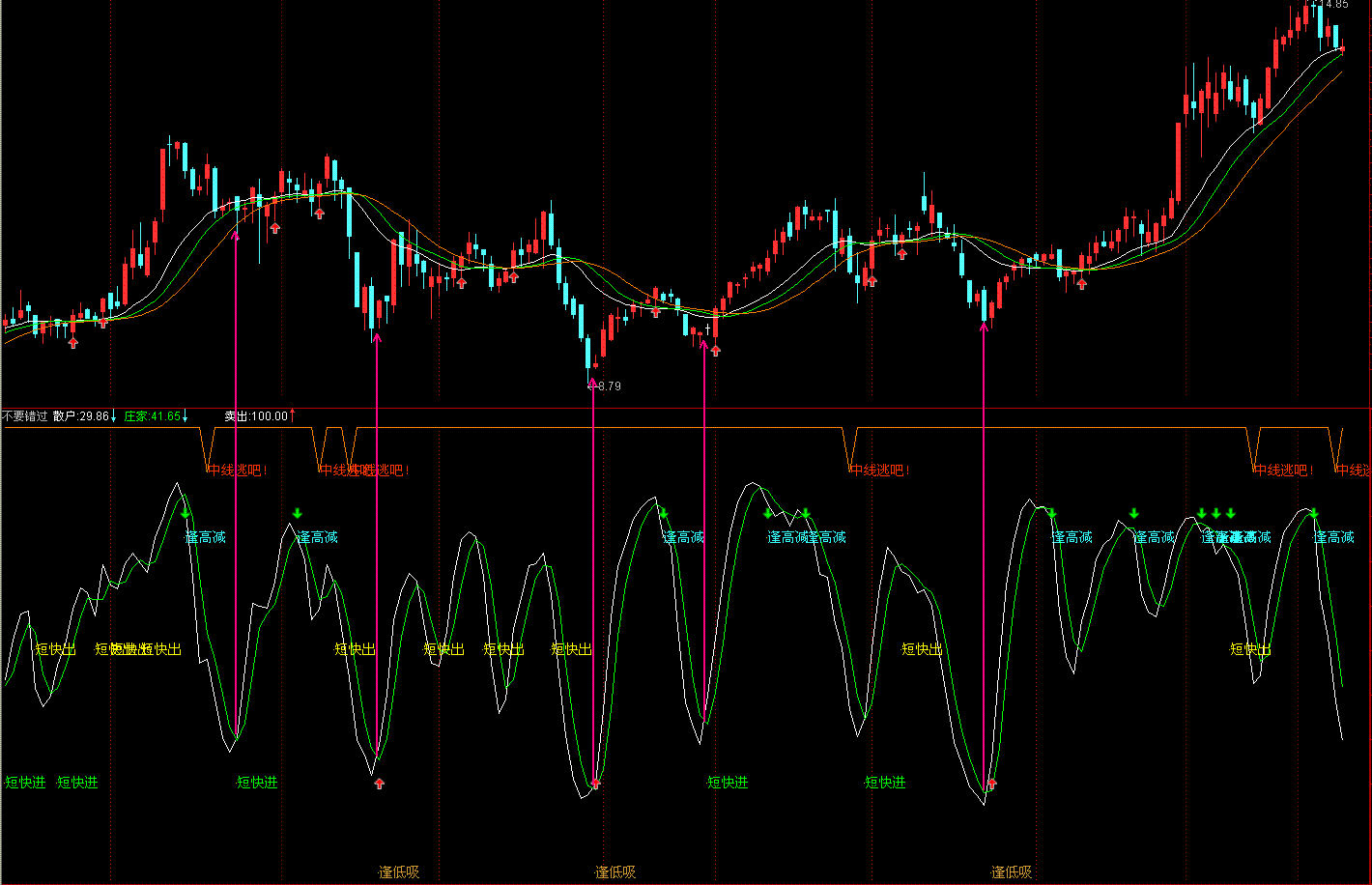 DRAWTEXT(CROSS(散户,庄家) AND 散户<50 AND 29<散户,20,'短快进'),COLOR00FF00;