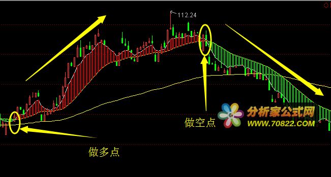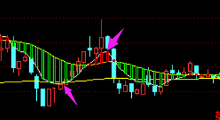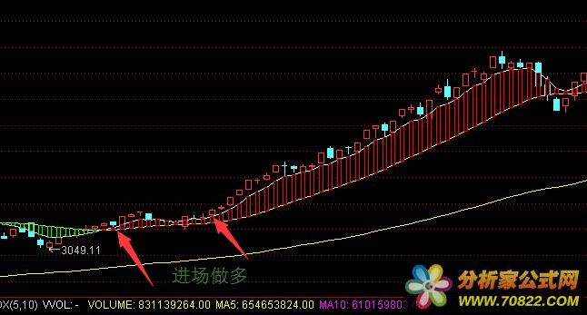 如上图股价2015/02/16日出现红色火焰,后面有K线被胜利火焰烧掉,意味着要暂时退场,在2015/03/12K线再次向上,则说明趋势再次加强,之后便是一路在火焰上方暴涨。一、单边向上方向【印钞机的黄s趋势线向上】如图黄s趋势线是向上的说明是多头趋势,多头趋势的做多手法有两种:1、多头趋势则每次由绿柱变成红柱的时候往往是最好的做多时机。{程序化交易 www.cxh99.com }