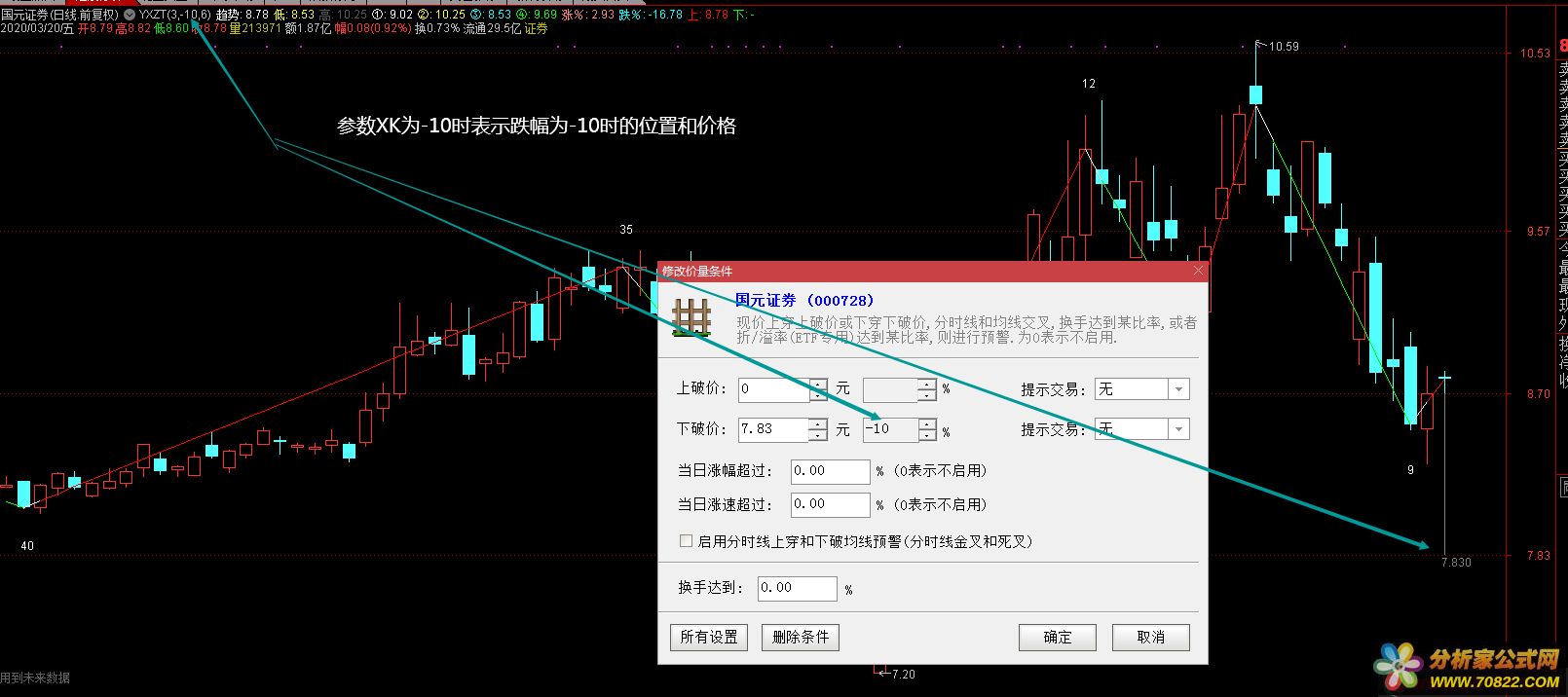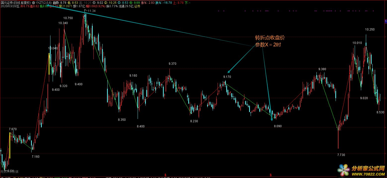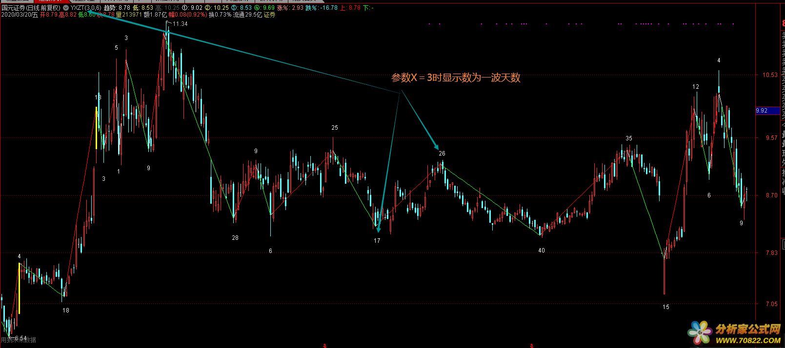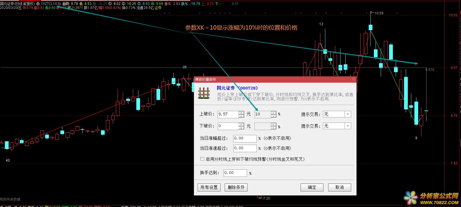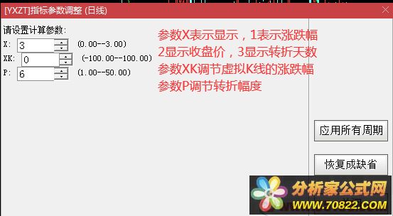 自用主图,把习惯要用的东西设成参数放一起了,说明都在图中趋势:ZIG(3,P);↑:=TROUGHBARS(3,P,1),COLOR0000FF,NODRAW;↓:=PEAKBARS(3,P,1),COLOR00FF00,NODRAW;低:IF(↑=0,C,IF(↓<↑,TROUGH(3,P,1),REF(TROUGH(3,P,1),1))),NODRAW;高:IF(↓=0,C,IF(↑<↓,PEAK(3,P,1),REF(PEAK(3,P,1),1))),NODRAW;①:IF(↓<↑,REF(高,↑),REF(低,↓)),COLORWHITE,NODRAW;②:IF(↓<↑,REF(低,↓),REF(高,↑)),COLORYELLOW,NODRAW;③:IF(↓<↑,高,低),COLORCYAN,NODRAW;④:②*③/①,COLORGREEN,NODRAW;涨%:IF(↑<↓,(C/低-1)*100,REF((C/低-1)*100,↓)),COLORLIRED,NODRAW;跌%:IF(↓<↑,(C/高-1)*100,REF((C/高-1)*100,↑)),COLORCYAN,NODRAW;{以下设置主图显示方式}上:IF(趋势>REF(趋势,1),趋势,DRAWNULL),COLORRED;下:IF(趋势<REF(趋势,1),趋势,DRAWNULL),COLORGREEN;{程序化久久公式网}ZT:=(C-REF(C,1))/REF(C,1)>0.095 AND C=H;STICKLINE(ZT,C,O,1,0),COLORYELLOW;XSS:=IF(X=1,涨%,IF(X=2,C,IF(X=3,BARSLAST(↑=1)+1,DRAWNULL)));XSX:=IF(X=1,跌%,IF(X=2,C,IF(X=3,BARSLAST(↓=1)+1,DRAWNULL)));DRAWNUMBER(↓=0 AND X,H*1.02,XSS);DRAWNUMBER(↑=0 AND X,L*0.98,XSX);STICKLINE(REF(XK<>0,1) AND ISLASTBAR,REF(C,1)*(1+XK/100),REF(C,1),0,0),COLORGRAY;DRAWNUMBER(REF(XK<>0,1) AND ISLASTBAR,REF(C,1)*(1+XK/100),REF(C,1)*(1+XK/100)),COLORGRAY;IF(XK>=10,CONST(REF(C,1)*(1+XK/100)),DRAWNULL),COLORLICYAN;{程序化交易 www.cxh99.com }