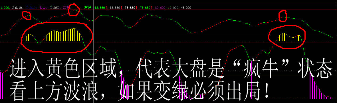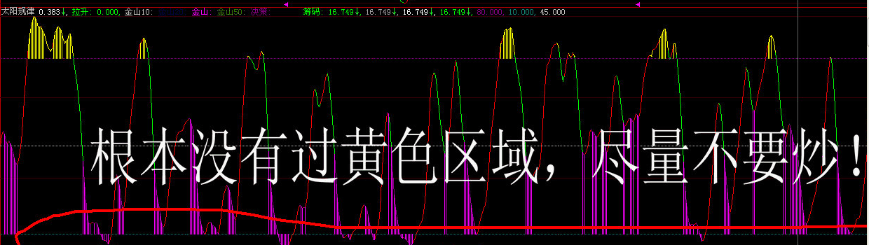 用于个股,可以研判强弱,下方资金线最近没变黄过,不要炒,没有资金运作,或运作资金太少,这样的股一般长期趴着!当然用于个股逃顶也是一样,需配合“太阳波浪”当然也可以是你自己的各种“波浪”。注意:黄s区域,出现逃顶信号必须出局。(这时风险大于收益){程序化交易 www.cxh99.com }