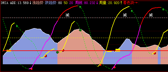 跌趋势:FILLRGN((MDI-PDI)/(MDI+PDI)>=0,10,ADX),COLORDD9988;