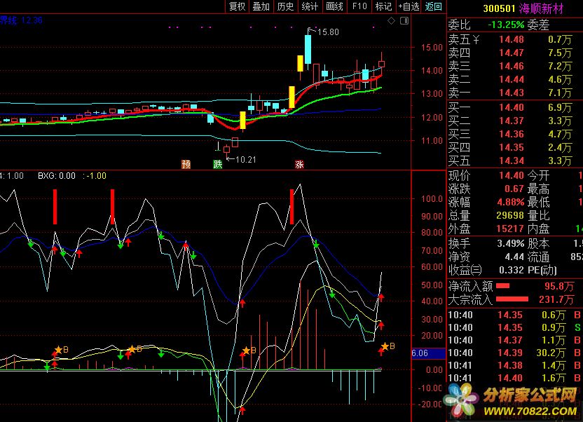 {双金叉}{参数:SHORT 5 ,60 ,6;LONG 10, 40 ,13;M 2,30 ,5;}DIF:(EMA(CLOSE,SHORT)-EMA(CLOSE,LONG))*100;DEA:EMA(DIF,M);MACD:(DIF-DEA)*2,COLORSTICK;DRAWICON(CROSS(DIF,DEA),DEA,1);DRAWICON(CROSS(DEA,DIF),DEA,2);IF(DIF<DEA,DIF,DRAWNULL),COLORGREEN;DD:=C=HHV(C,180);EE:=DEA< REF(DEA,1) AND REF(DEA< REF(DEA,1),1)=1;CC:=C> REF(C,1) AND REF(C> REF(C,1),1)=1;清仓:=(DD AND EE AND DEA< HHV(DEA,180))*DEA;A2:=BARSLAST(REF(CROSS(DEA,DIF),1));{清仓:=REF(CLOSE,A2+1)<CLOSE AND REF(DIF,A2+1)>DIF AND CROSS(DEA,DIF);}DRAWLINE(A2=0,DEA,清仓,DEA,0),COLORBROWN,LINETHICK2;RSV:=(CLOSE-LLV(LOW,9))/(HHV(HIGH,9)-LLV(LOW,9))*100;K:SMA(RSV,9,3);D:SMA(K,9,3);J:3*K-2*D;IF(J<D,J,DRAWNULL),COLORFFEE44;A1:=BARSLAST(REF(CROSS(DIF,DEA),1));B1:=REF(C,A1+1)>C AND REF(DIF,A1+1)<DIF AND CROSS(DIF,DEA);A22:=BARSLAST(REF(CROSS("KDJ.K"(9,3,3),"KDJ.D"(9,3,3)),1));B2:=REF(C,A22+1)>C AND REF("KDJ.K"(9,3,3),A22+1)<"KDJ.K"(9,3,3) AND CROSS("KDJ.K"(9,3,3),"KDJ.D"(9,3,3));A3:=BARSLAST(REF(CROSS("RSI.RSI1"(6,12,24),"RSI.RSI2"(6,12,24)),1));B3:=REF(C,A3+1)>C AND REF("RSI.RSI1"(6,12,24),A3+1)<"RSI.RSI1"(6,12,24) AND CROSS("RSI.RSI1"(6,12,24),"RSI.RSI2"(6,12,24));DRAWTEXT(B1,DEA-0.20,'▲'),COLORWHITE;DRAWTEXT(B2,D-0.20,'▲'),COLORYELLOW;{DJ:=CROSS(J,D) AND D<20;DRAWTEXT(DJ,J-0.3,'▲'),COLORMAGENTA;MDJ:=CROSS(DIF,DEA) AND DEA<0;DRAWTEXT(MDJ,DEA-0.3,'▲'),COLORRED;DRAWTEXT(CROSS(DEA,DIF),DIF+0.3,'S'),COLORCYAN;DRAWTEXT(CROSS(D,J),J+0.3,'S'),COLORGREEN;}A:=CROSS(DIF,DEA) AND CROSS(K,D) AND CROSS(J,D);DRAWICON(A,LOW*0.98,1);B4:CROSS(DIF,DEA) AND CROSS("KDJ.K"(9,3,3),"KDJ.D"(9,3,3));DRAWTEXT(B4,L-0.20,'B'),COLOR0099FF;DRAWICON(CROSS(K,D),D,1);DRAWICON(CROSS(D,K),D,2);BA:=DEA>REF(DEA,1);BB:=SUM(BA,5)>=4;BC:=C<O;BD:=SUM(BC,5)>=2;BXG:FILTER(BB AND BD AND J>REF(J,1) AND REF(J,1)<REF(J,2),3);STICKLINE(BXG,HHV(J,60),HHV(J,60)-20,1,0),COLORRED;SS:=EMA(C,11);LL:=(EMA(C,1)+EMA(C,2)+EMA(C,3)+EMA(C,5))/4;{短:EMA(LL,2),COLORGREEN,LINETHICK2;}{长:EMA(SS,2),COLORMAGENTA,LINETHICK2;}AA:=(C-LLV(C,10))/(HHV(C,10)-LLV(C,10));(CROSS(AA,0.05)-1);