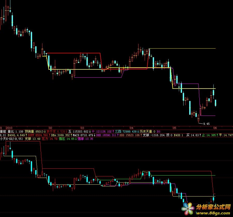 强撑:IF(L<RL4 AND j>RL42 AND j>j24,L,REF(L,BARSLAST(L<RL4 AND j>RL42 AND j>j24))),COLORMAGENTA;