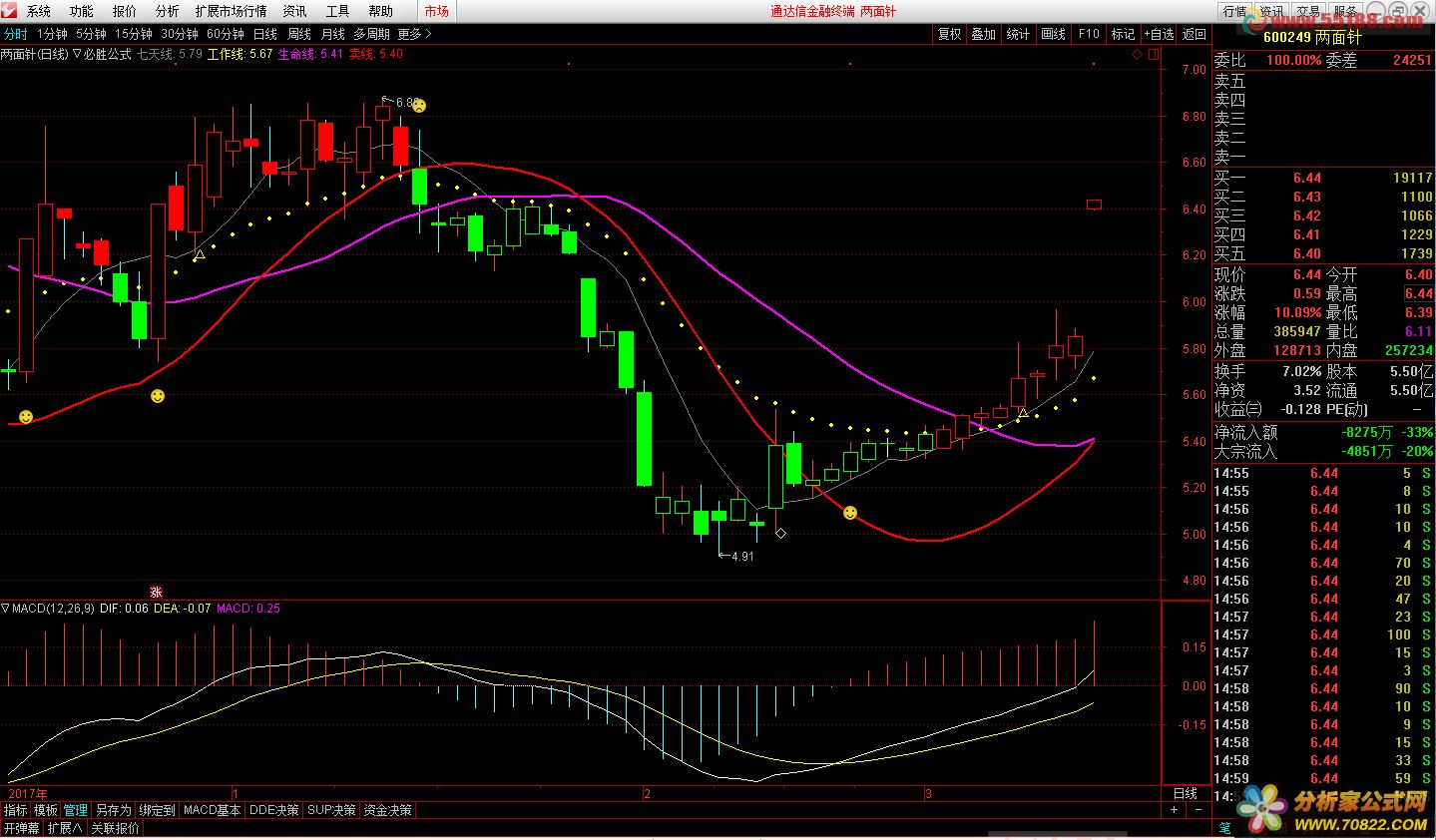 1. **七天线(MA)**:观察股价是否在七天线之上或之下,判断短期趋势的强弱。