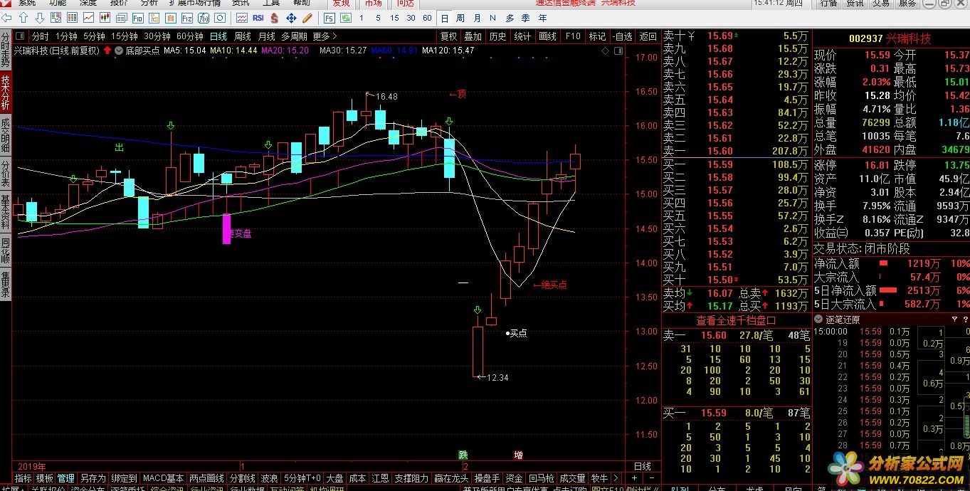 AA:=BARSCOUNT(C);AH:=HHV(H,200);AL:=LLV(L,200);A0:=(AH-AL)/40;B1:=L-A0;MA5:MA(C,5);MA6:=MA(C,6);MA10:MA(C,10);MA20:MA(C,20);cxhE:=MA(100*(CLOSE-LLV(CLOSE,34))/(HHV(HIGH,34)-LLV(LOW,34)),5)-20;cxh12:=(HIGH+LOW+CLOSE)/3;cxh13:=(cxh12-MA(cxh12,14))/(0.015*AVEDEV(cxh12,14));cxh14:=(cxh12-MA(cxh12,70))/(0.015*AVEDEV(cxh12,70));cxh15:=IF(cxh13>=150 AND cxh13<200 AND cxh14>=150 AND cxh14<200,10,0);cxh16:=IF(cxh13<=-150 AND cxh13>-200 AND cxh14<=-150 AND cxh14>-200,-10,cxh15);cxh17:=(CLOSE-MA(CLOSE,13))/MA(CLOSE,13)*100;cxh18:=100-ABS(cxh17);cxh19:=IF(cxh18<90,cxh18,100);A2:=REF(MA20,1);STICKLINE((AA+0)/34=FLOOR((AA+0)/34),B1,B1-1.5*A0,2,0),COLORF00FF0;DRAWTEXT((AA+0)/34=FLOOR((AA+0)/34),B1-1*A0,'要变盘'),COLORF00FF0;cxh2S:=(2*CLOSE+HIGH+LOW)/4;cxh3S:=IF(YEAR>=2099 AND MONTH>2,0,1);cxh4S:=LLV(LOW,5); cxh5S:=HHV(HIGH,4);J1:=(MA20-A2)/A2*100;MJ1:=MA(J1,3);MA30:MA(C,30);MA60:MA(C,60);MA120:MA(C,120);cxh1A:=IF(cxhE>0,cxhE,0);cxh1B:=IF(cxh14>=200 AND cxh13>=150,15,IF(cxh14<=-200 AND cxh13<=-150,-15,cxh16))+60;cxh1C:=cxh1A>48 AND cxh1B>60 AND cxh19<100;乖离2:=(MA20-MA30)/MA30*100;cxh1:=IF(BETWEEN(乖离2,-2,5),2,0);散户:=EMA((cxh2S-cxh4S)/(cxh5S-cxh4S)*100,4)*cxh3S;庄家:=EMA(0.667*REF(散户,1)+0.333*散户,2)*cxh3S;DRAWTEXT(CROSS(散户,庄家) AND 散户<30,L-0.05,''),COLORRED;MAX1:=MAX(MA20,MA30);MAX2:=MAX(MAX1,MA60);MIN9:=MIN(MA20,MA30);MIN2:=MIN(MIN9,MA60);K1:=(MAX2/MIN2-1)*100;cxh2:=IF(K1<=8,1,0);BBB1:=MA(C,1);B2:=SMA(SMA(SMA(BBB1,2,1),2,1),2,1),COLORRED;SMA2:=MA(B2,2);cxhB1:=(100 - ((90 * (HHV(HIGH,21) - CLOSE)) / (HHV(HIGH,21) - LLV(LOW,21))));cxh3:=(100 - MA(((100 * (HHV(HIGH,6) - CLOSE)) / (HHV(HIGH,6) - LLV(LOW,6))),34));买:DRAWTEXT(CROSS(cxhB1,cxh3) AND B2>SMA2,(LOW * 0.97),'←绝买点'),COLORRED;上火车轨:=MA20>MA30 AND MA20>REF(MA20,1) AND MA30>REF(MA30,1) AND MA20-MA30>REF((MA20-MA30),1) ;STICKLINE(上火车轨,MA20,MA30,0,0),COLORRED;神枪手:=DRAWTEXT(FILTER(上火车轨 AND "MACD.DIF"<0.15 AND "MACD.DIF">REF("MACD.DIF",1) AND MA(V,60)>REF(MA(V,60),1) AND MA(V,5)>MA(V,10) AND J1>REF(J1,1) AND( L<=MA20 AND C>MA20 OR (CROSS(MA5,MA20)) ),5),L*0.98,'←神枪手');神枪手选股:=FILTER(上火车轨 AND "MACD.DIF"<0.15 AND "MACD.DIF">REF("MACD.DIF",1) AND MA(V,60)>REF(MA(V,60),1) AND MA(V,5)>MA(V,10) AND J1>REF(J1,1) AND( L<=MA20 AND C>MA20 OR (CROSS(MA5,MA20)) ),5);短线暴涨:DRAWTEXT(FILTER( (cxh1 OR cxh2) AND MA10>REF(MA10,1) AND COUNT(MA30>REF(MA30,1),3)=3 AND MA30>MA60 AND COUNT(CROSS(MA5,MA30),3) AND J1>MJ1 AND MA(V,5)>MA(V,60)AND MA(V,60)>REF(MA(V,60),1),5),MA60*0.99,'短线暴涨'),COLORRED;DRAWTEXT(CROSS("KDJ.K"(5,2,3),"KDJ.D"(5,2,3)) AND "KDJ.D"(5,2,3)<30 AND J1>MJ1 AND MA60>REF(MA60,1) AND COUNT(J1<1,3)>=1 ,L*0.995,'←买入'),COLORYELLOW;DRAWTEXT(CROSS("KDJ.D"(5,2,3),"KDJ.K"(5,2,3)) AND "KDJ.D"(5,2,3)>65 AND J1>=1,H*1.005,'←卖出'),COLORGREEN;DRAWTEXT(CROSS("KDJ.D"(18,9,6),"KDJ.K"(18,9,6)) AND "KDJ.D"(18,9,6)>60 AND "KDJ.J"(45,15,15)>90,H*1.03,'←顶'),COLORRED;DRAWTEXT(CROSS(MA5,MA6) AND "KDJ.K"(5,3,3)>=50 AND "KDJ.J"(5,3,3)<31 ,L*0.92,'←再买'),COLORMAGENTA;XL1:=((LLV(LOW,3) = LLV(LOW,60)) AND ((CLOSE / REF(CLOSE,1)) >= 1.04));XL2:=(((CLOSE - EMA(CLOSE,21)) / EMA(CLOSE,21)) * 100);XL3:=CROSS(XL2,(0 - 20));DRAWTEXT(FILTER(((XL1 > 0) AND LOW),5),(LOW - 0.4),'●买点');DRAWTEXT((XL3 > 0),(LOW - 0.2),'●绝对底部');X6:=REF(CLOSE,1);X7:=((SMA(MAX((CLOSE - X6),0),7,1) / SMA(ABS((CLOSE - X6)),7,1)) * 100);X8:=CROSS(79,X7);X9:=FILTER(X8,4);DRAWTEXT(X9,(HIGH * 1.02),'●出货'),COLOR9000F5;STICKLINE(C>1.098*REF(C,1),C,O,0,0),COLORYELLOW;DRAWTEXT(cxh1C AND COUNT(cxh1C,30)=1,HIGH*1.02,'大笔出货'),LINETHICK1,COLORFFCC66;AA1:=AMOUNT/V;BB1:=L; CC1:=(C-REF(C,1))/REF(C,1)*100>1.2;DD1:=L; EE1:=V; AAA:=CONST(HHV(H,90));R1:=MA(CLOSE,1);R2:=MA(CLOSE,3);R3:=(MA(R2,1)*1);R4:=(MA(R2,3)*1);DRAWTEXT(CROSS(R3,R4),(LOW-0.1),''),COLORYELLOW;LC:=REF(CLOSE,1);RSI:=((SMA(MAX((CLOSE - LC),0),3,1) / SMA(ABS((CLOSE - LC)),3,1)) * 100);W:=(CLOSE-LLV(LOW,4))/(HHV(HIGH,4)-LLV(LOW,4))*100;FF:=EMA(CLOSE,3);MA15:=EMA(CLOSE,21);DRAWTEXT(CROSS(88,RSI),(HIGH * 1.02),'出'),COLORGREEN;老鼠仓:=BB1 AND CC1 AND DD1 AND EE1,LINETHICK0;DRAWTEXT(老鼠仓,(LOW* 0.99),'老鼠仓'),COLOR40CCFF;{程序化交易 www.cxh99.com }