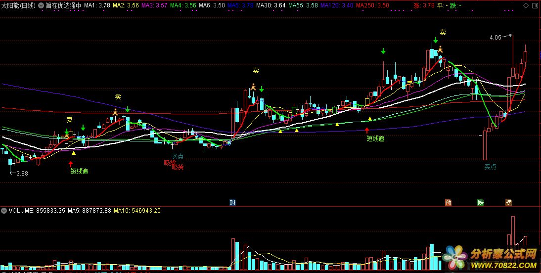 N1:=7;M1:=5;M2:=10;M3:=20;M4:=60;M5:=120;M6:=250;MA1:MA(CLOSE,M1);MA2:MA(CLOSE,M2);MA3:MA(CLOSE,M3);MA4:MA(CLOSE,M4);MA6:MA(CLOSE,M6);MA5:MA(C,5);MA10:=MA(C,10);MA20:=MA(C,20),COLOR33FFFF;cxh1:=REF(C,1);cxh2:=SMA(MAX(C-cxh1,0),N1,1)/SMA(ABS(C-cxh1),N1,1)*1000;cxh3:=cxh2<=LLV(cxh2,N1),cxh2,1;MA30:MA(C,30),COLORFFFFFF,LINETHICK2;MA55:MA(C,55),COLORCCFF66,LINETHICK1;cxh4:=cxh2=cxh3;cxh5:=cxh2<REF(cxh2,1);MA120:MA(C,120),COLORFF0066;MA250:MA(C,250),COLOR0000FF;DRAWICON(cxh4 AND cxh5,L*0.98,1);DRAWTEXT(cxh4 AND cxh5,L*0.95,'买')COLORRED;RSV:=(C-LLV(L,25))/(HHV(HIGH,25)-LLV(L,25))*100;K:=SMA(RSV,3,1);D:=SMA(K,3,1);J:=3*K-2*D;BM1:=(C+O)/2;BM2:=COUNT(MA30>REF(MA30,1),5)=5 OR COUNT(MA55>REF(MA55,1),5)=5;BM3:=COUNT(MA5/MA30>REF(MA5/MA30,1),5)=5;cxh6:=(2*C+H+L)/4;cxh7:=EMA(EMA(EMA(cxh6,4),4),4);BM4:=(BM1*2-REF(BM1,3));BM5:=C/MA(C,5);BM6:=REF(BM1/MA(BM1,5),1);BM7:=COUNT(BM6>BM5,3)=3;BM8:=C>O;cxh8:=(cxh7-REF(cxh7,1))/REF(cxh7,1)*100;cxh9:=MA(cxh8,3)+0.03;cxh10:=MA(cxh8,1);买:=(CROSS(BM4,MA5) OR CROSS(BM4,MA30)) AND BM2 AND BM8 AND C>MA(C,60);优选:=买 AND (BM7 OR REF(BM7,1) OR REF(BM7,2)),COLORYELLOW,LINETHICK2;STICKLINE(买,O,C,4,1),COLOR00FF00,LINETHICK2;DRAWTEXT(买 ,LLV(L,2)*0.98,'▲'),COLORYELLOW;DRAWICON(CROSS(cxh9,cxh10) AND J>65,H*1.02,15),COLORGREEN;DRAWTEXT(CROSS(cxh9,cxh10) AND J>65,H*1.05,'卖'),COLORYELLOW;AA:=BARSCOUNT(C);AH:=HHV(H,120);AL:=LLV(L,120);A0:=(AH-AL)/30;DRAWTEXT(优选,LLV(L,2)*0.93, '短线追'),COLOR00FF66;DRAWICON(优选,LLV(L,2)*0.96, 1);STICKLINE(优选,O,C,4,1),COLORYELLOW,LINETHICK2;cxh2S:=(2*CLOSE+HIGH+LOW)/4;cxh3S:=IF(YEAR>=2099 AND MONTH>2,0,1);cxh4S:=LLV(LOW,5); cxh5S:=HHV(HIGH,4);BM9:=(CLOSE-LLV(LOW,34))/(HHV(HIGH,34)-LLV(LOW,34))*100;涨:IF(MA(CLOSE,5)>REF(MA(CLOSE,5),1),MA(CLOSE,5),DRAWNULL),COLORRED,LINETHICK2;平:IF(MA(CLOSE,5)=REF(MA(CLOSE,5),1),MA(CLOSE,5),DRAWNULL),COLORYELLOW,LINETHICK3;跌:IF(MA(CLOSE,5)<REF(MA(CLOSE,5),1),MA(CLOSE,5),DRAWNULL),COLORGREEN,LINETHICK2;散户:=EMA((cxh2S-cxh4S)/(cxh5S-cxh4S)*100,4)*cxh3S;庄家:=EMA(0.667*REF(散户,1)+0.333*散户,2)*cxh3S;BM10:=3*SMA(BM9,3,1)-2*(SMA(SMA(BM9,3,1),3,1));DRAWICON(CROSS(90,BM10),H*1.03,2);DRAWTEXT(CROSS(散户,庄家) AND 散户<30,L*0.95,'吸货'),COLORRED;DRAWTEXT(CROSS(0.9,1/VOL*1000>0.01 AND "KDJ.J"<0),L*0.98,'买点'),COLORLICYAN;{程序化交易 www.cxh99.com }