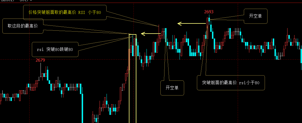 RSI 上80 后 下80取第一个高度的价格 后面是价格突破前面的价格,但是RSI不能大于80 一直这样取高点 突破做空 知道RSI 下坡20 后 这波算结束